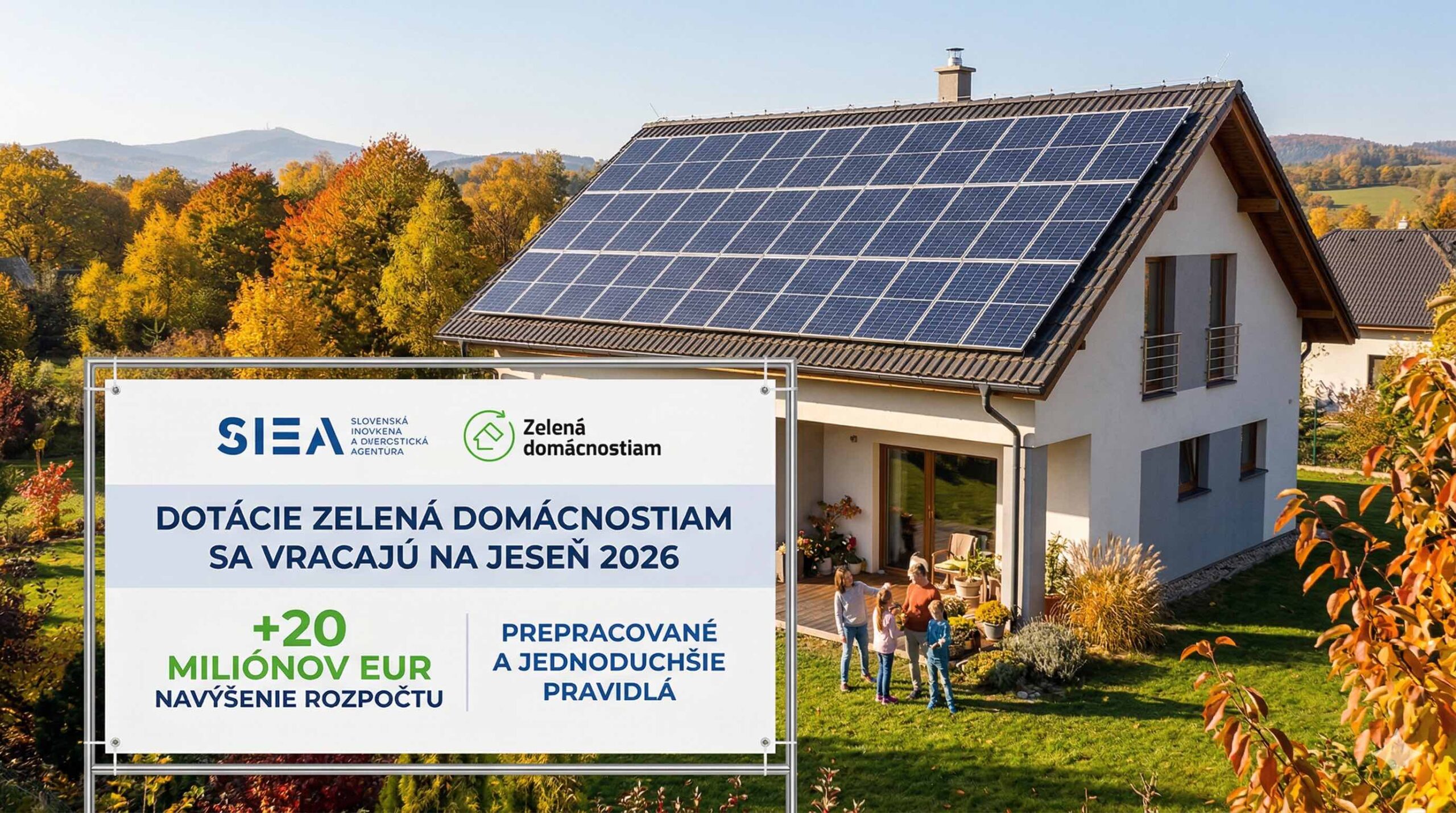 Slovenská inovačná a energetická agentúra pripravuje zásadnú zmenu projektu Zelená domácnostiam spojenú s navýšením rozpočtu o ďalších 20 miliónov eur. Tlačová správa vychádza z oficiálnych informácií a údajov zverejnených k 31. 3. 2026 v rámci projektu Zelená domácnostiam. Program Zelená domácnostiam bude v roku 2026 pokračovať a podľa aktuálnych informácií sa má na jeseň posilniť o ďalších približne 20 miliónov eur, pričom Slovenská inovačná a energetická agentúra avizuje jednoduchšie pravidlá a prepracovanú administráciu. Pre trh rezidenčnej fotovoltiky je to jasný signál, že podpora malých obnoviteľných zdrojov energie pre domácnosti zostáva kľúčovou súčasťou energetickej politiky.